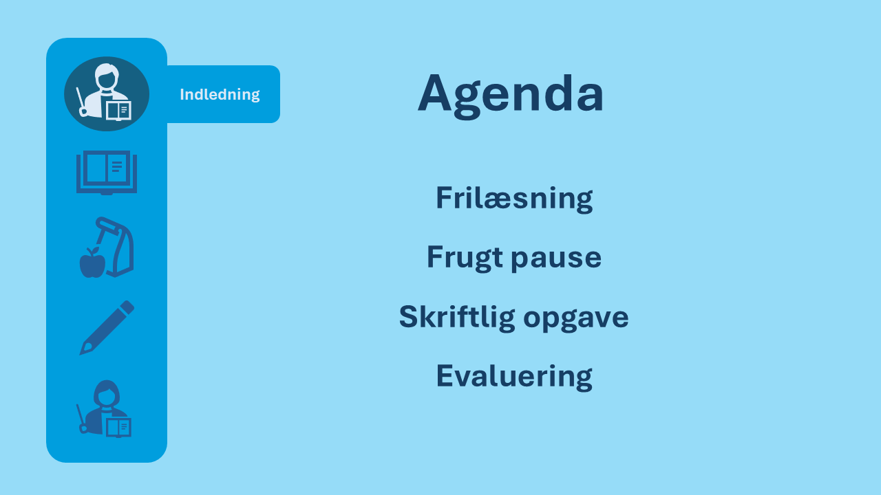 En skabelon der ligger op til frilæsning, frugt pause, skriftlig opgave og evaluering.