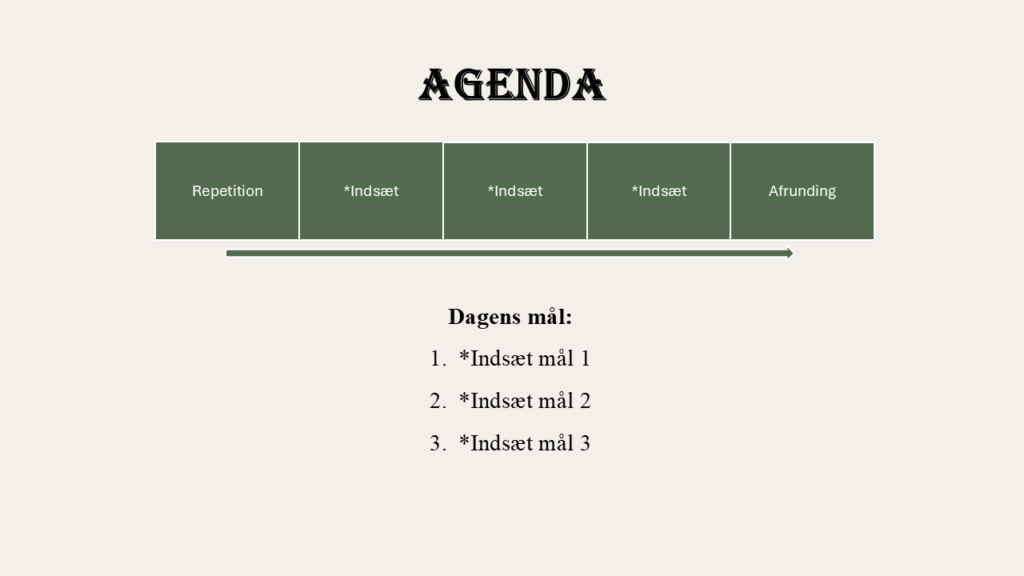 En skabelon til nemt og hurtigt at lave en PowerPoint med agenda, mål, repetition og afrunding.